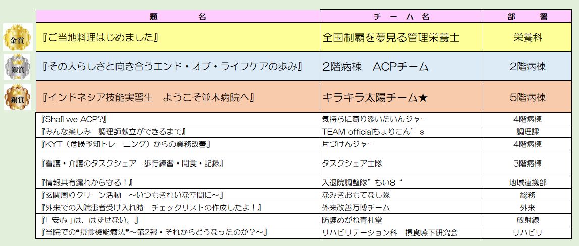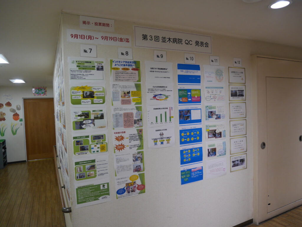 昨年に引き続き、QC活動を報告する場として、活動内容を掲示する発表会を開催しました。今年度は、12チーム12題の発表がありました。職員で投票を行った結果、栄養科の「全国制覇を夢見る管理栄養士」、テーマ「ご当地料理はじめました」が金賞を受賞しました。3回目の今回は、90%以上の職員が投票に参加し、QC活動に対する意識が年々高まっているように思います。